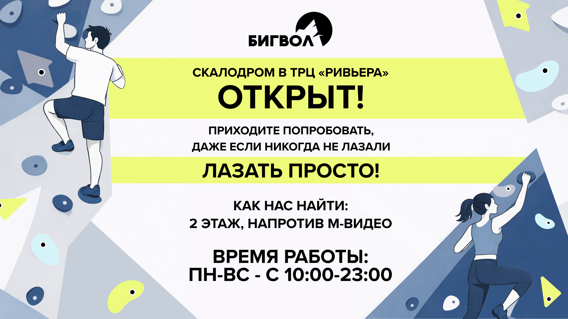 Боулдер-зал Бигвол — это новое пространство для скалолазания в современном торговом центре «Ривьера».